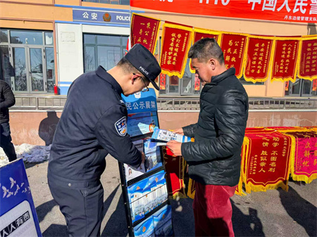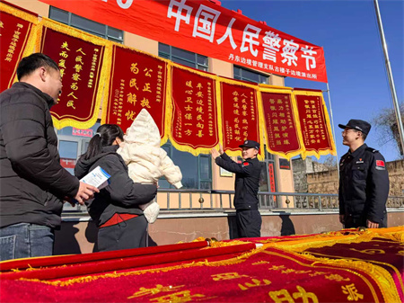 和煦暖阳遍洒庭院,大红横幅醒目高悬。1月8日,在辽宁宽甸满族自治县古楼子乡南荒沟村委会大院,丹东边境管理支队古楼子边境派出所民警身着藏青蓝警服,热情接待到场村民,共同开展“警民同心护平安”警察节主题宣传活动。民警以锦旗为媒,诉说背后的警察故事,并以此次活动为契机,贴心为群众答疑解惑、向人民汇报工作答卷,推动“红心蓝盾 边江锋警”党建品牌扎根基层,持续厚植警民鱼水深情。