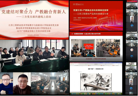 近日,江苏工程职业技术学院数字与创意设计学院党总支、鲁迅美术学院视觉传达设计学院党总支、辽宁广告职业学院工艺美术系党总支相聚“云端”,共同启动以“党建结对聚合力、产教融合育新人”为主题的党建共建活动。此次跨地域、跨类型院校的党组织联动,旨在通过高质量党建引领,共同探索技术技能人才培养的创新实践。